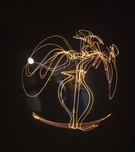 Se passarmos os olhos pelos sites dedicados à fotografia, é comum vermos aquelas em que se usam luzes para pintar algumas formas novas. O surpreendente é Picasso ter usado esta técnica, como se pode ver na imagem.